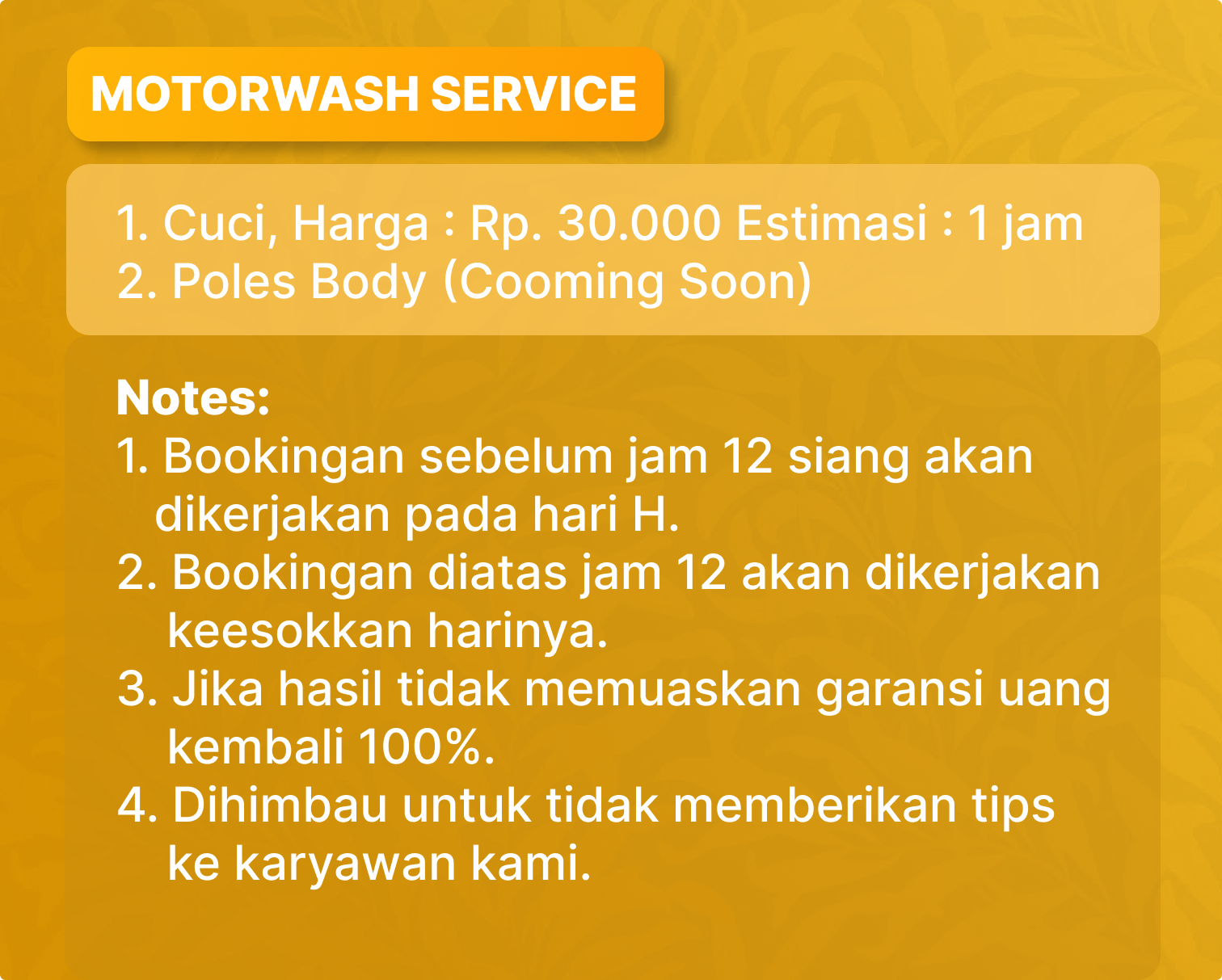 1. Bookingan sebelum jam 12 siang akan dikerjakan pada hari H.